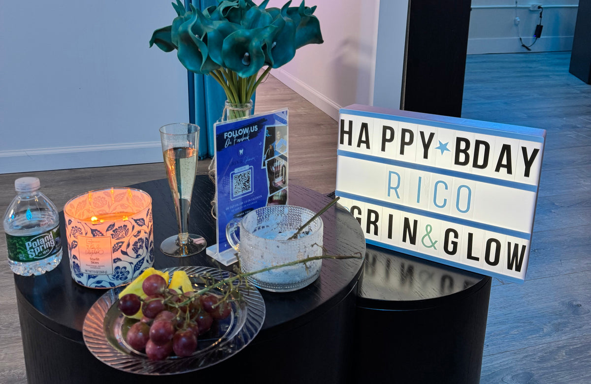 Have a birthday or special day coming up? Let us know in advance! At Grin & Glow®, we love creating a spa-like experience that makes every visit feel special. To enhance your appointment, we treat clients to complimentary drinks and light refreshments.