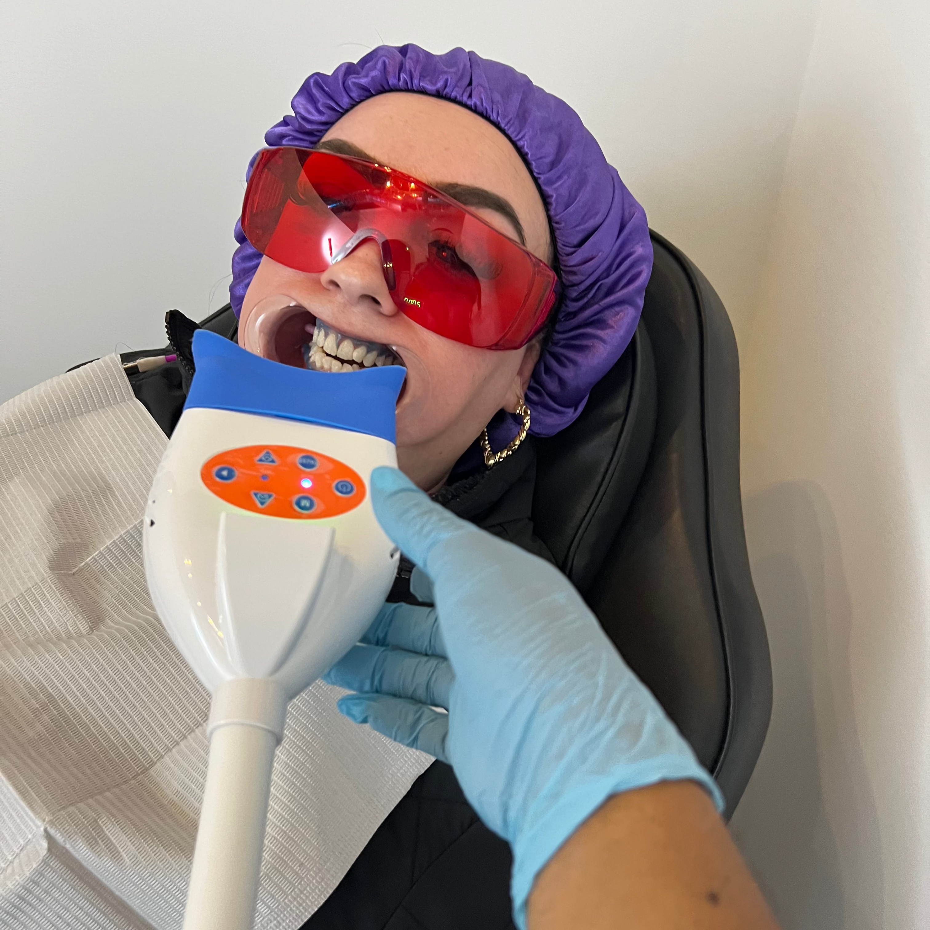 Teeth whitening employs agents like hydrogen peroxide to break down and lift stains from the enamel. At Grin and Glow, our specialists use a hand-application method with a custom formula and advanced whitening lights for quick, effective, and visible results.